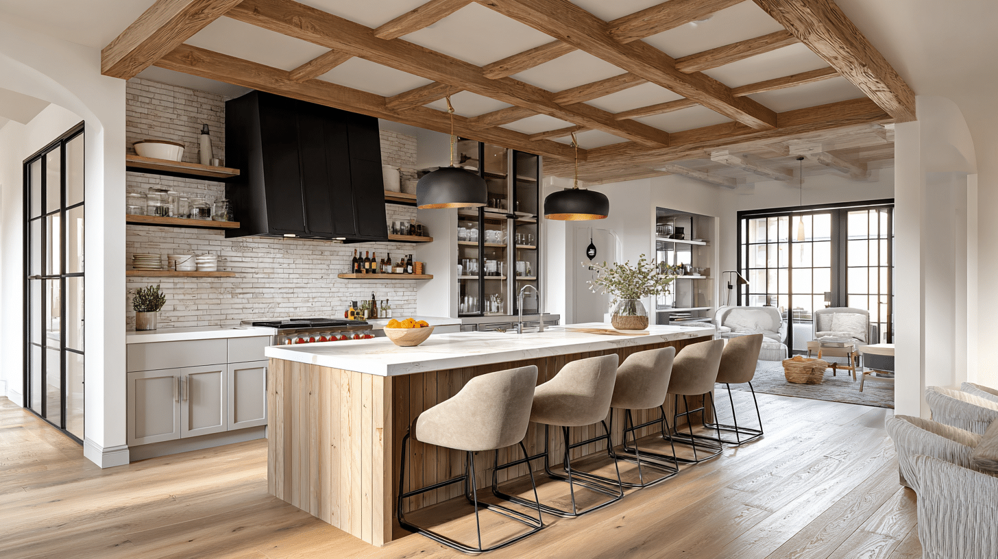 - 1. Farmhouse-Inspired Barndominium Kitchen with Rustic Beam Details