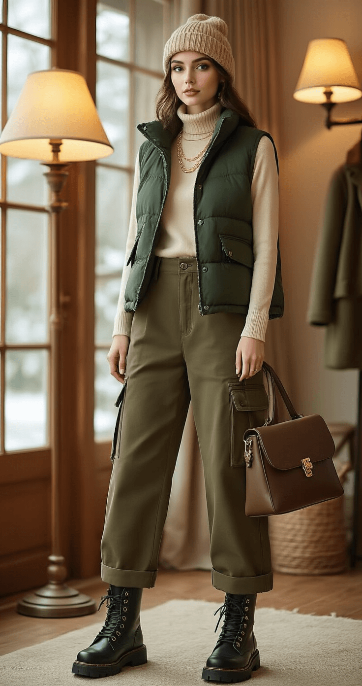 The sweater vest trend is still going strong, and it’s perfect for winter. Layer a sweater vest over a collared button-up shirt, and pair it with straight-leg or wide-leg jeans. Add loafers or chunky boots to finish the look. This outfit feels a little preppy and academic in the best way. It’s also super easy to layer if you get cold — just throw a coat over it.